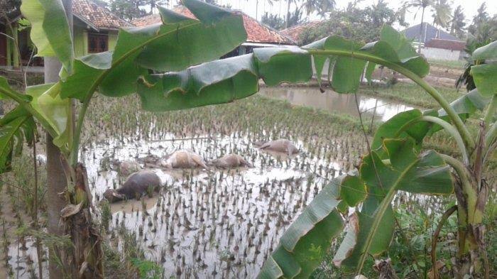“Tidak menyangka hari ini dia dan 5 kerbaunya tersengat aliran listrik di sawah milik Ganut,” katanya.