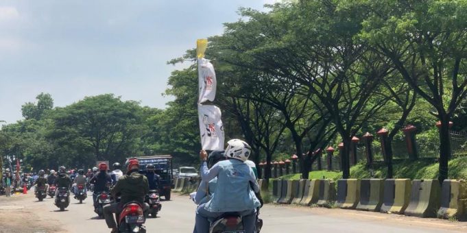 Pantauan BantenNews.co.id di lokasi, puluhan massa berdatangan dari Kota Cilegon menuju Kantor Pusat Pemerintahan Provinsi Banten (KP3B). Mereka konvoi menggunakan motor hingga mobil pikap dengan memadati ruas Jalan Raya Cilegon-Serang.