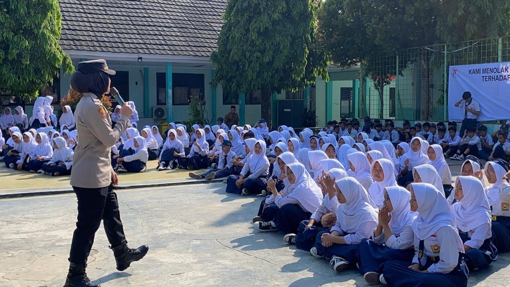 infobanten.id | Serang – Polwan Polda Banten menggelar kampanye bertajuk “Rise and Speak” dengan tema Menolak Segala Bentuk Tindak Kekerasan terhadap Perempuan dan Anak yang ditujukan kepada para pelajar di SMPN 9 Kota Serang pada Senin (15/09).